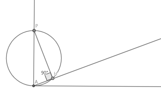 $\overline{PA}$를 지름으로 하는 원을 그리고, 그 원과 경사의 교점을 $H$라고 해보자. $∠PHA$는 지름에 대한 원주각이므로 $90˚$일 것이다. 그리고 위에서 밝힌 사실에 의해서 공을 막대 $\overline{PH}$로 떨어뜨리는데 걸리는 시간은 $P$에서 $A$로 자유낙하하는데 걸리는 시간과 같다. 이렇게 그리고 보면, 막대는 선분 $\overline{AH}$위에 있는 어떤 점에 놓여야한다는 것을 쉽게 알 수 있다. 이제 이 원을 조금 더 축소해서 그려보자.