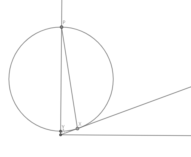 이번엔 원의 중심이 선분 $\overline{PA}$ 위에 있고, $P$를 지나면서 경사와 접하는 원을 그려보았다. 이 경우 막대 $\overline{PX}$를 타고 내려가는 시간은 $P$에서 $Y$까지 자유낙하하는 시간과 같다. 이 그림에서 다른 모든 막대들을 그려보았을 때 이 시간보다 짧게 내려갈 수 있는 시간은 없다. 따라서 구하는 막대는 바로 $\overline{PX}$가 된다. 이제 계산해주는 일만 남았다.