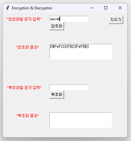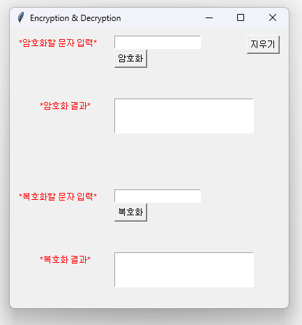 파이썬에서 tkinter 모듈을 이용해서 암호화 복호화 프로그램을 만들어보았다. 그러려면 tkinter 창의 간단한 디자인과 암호화 복호화 방법을 정해야한다.