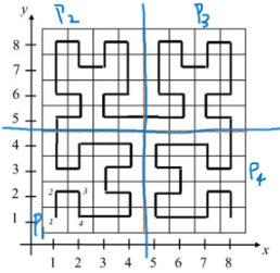 Hilbert Curve가 재귀적으로 정의되는 모양이다보니까 이 문제도 재귀적으로 풀어야겠다는 생각을 했다. 이 때 미로를 $\frac{n}{2}$ 크기의 네 구역으로 나누어서 분할정복 알고리즘으로 플 수 있다고 생각했다. 그래서 먼저 좌표를 반환해주는 함수를 다음과 같이 정의해보자.