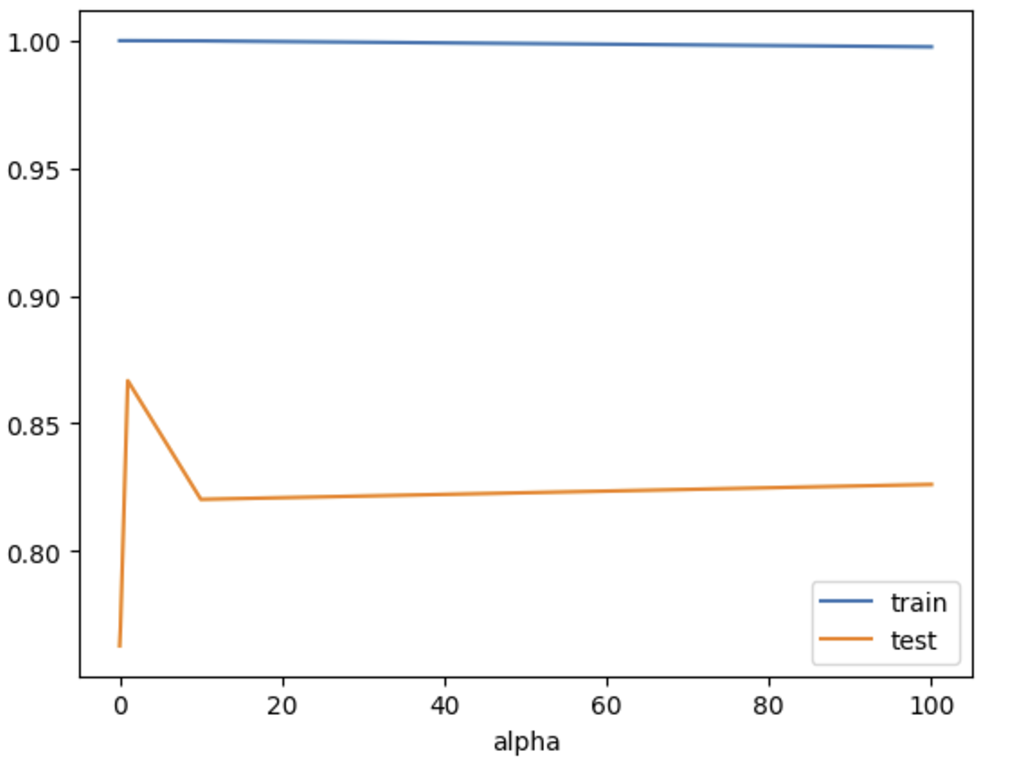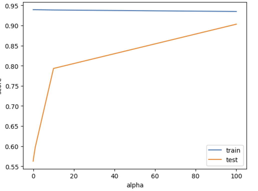 결과를 보면 차수가 2일 때는 여전히 과대적합이 일어나는 것을 볼 수 있고, 차수가 1일 때 점수는 낮지만 어느정도 해결된 것을 볼 수 있다. 또한 알파값이 100일 때 성능이 가장 좋다. 그래서 차수를 1로, 알파값을 100으로 하여 라쏘 회귀를 하였다.
