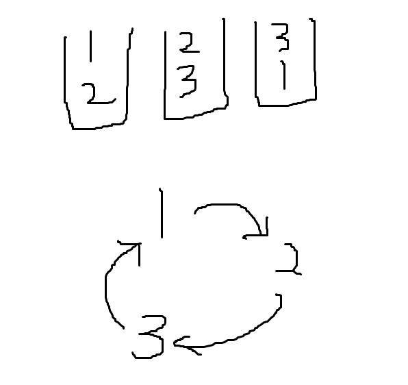문제를 잘 관찰해보면 가능한 순열의 종류가 크게 두 가지임을 알 수 있다. 첫 번째는 모든 정점에서 모든 정점까지 경로가 존재하는 사이클과 out-degree가 2, in-degree가 2인 정점이 각각 하나씩 있는 DAG가 있다. 그렇지만 두 그래프 모두 어떤 정점에서 시작해 방향 간선을 따라 이동시키다보면 결국에는 $($구성원소 개수$) + 1$만큼의 시행으로 모두 크기 1짜리 기본 사이클로 바꿀 수 있다.