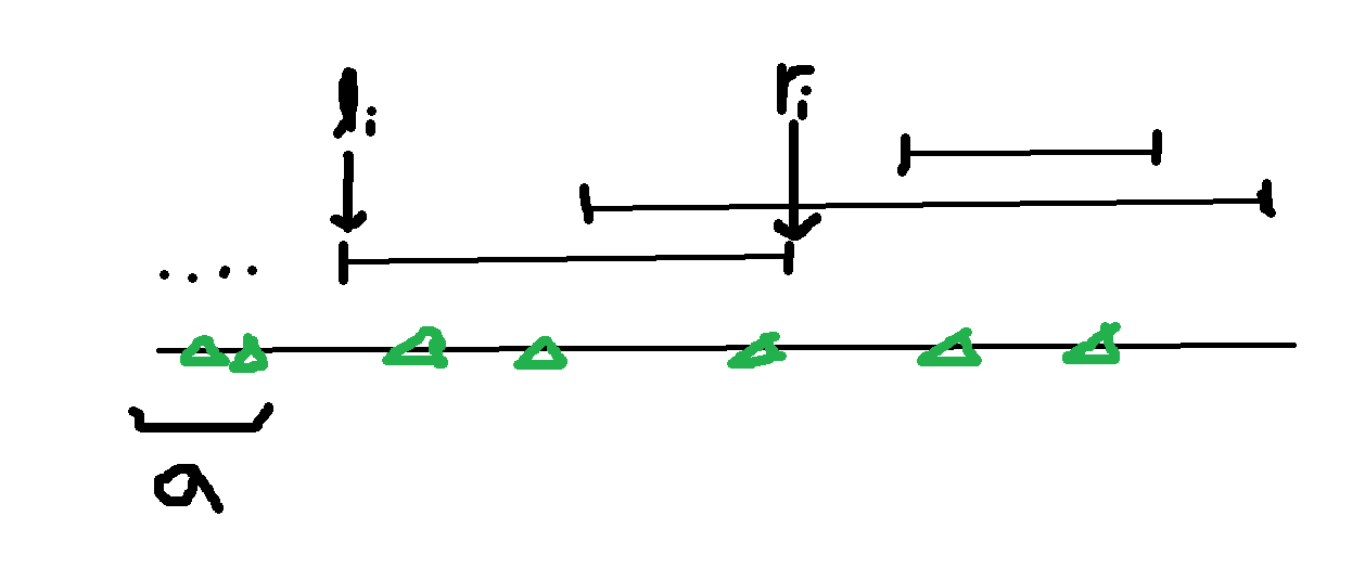 처음에 접근할 때에는 자신이 포함되어있는 규제가 많은 나무들을 선택하려고 했었는데 구현도 복잡할 거 같고 시간복잡도도 상당할 것 같아서 금방 철회했다. 어떤 구간에서 제거할 수 있는 나무들의 개수 $cutNum$ 는 그 구간에 존재하는 모든 나무의 개수 $existing$와 최소한 필요한 나무의 개수 $t$의 차이이다. $($i.e. $cutNum = existing - t)$ 따라서 규제의 오른쪽 끝 $r_i$까지 제거한 나무의 최대 개수는 $l_i$이전까지 자른 나무의 개수 $a$와 $cutNum$의 합이다.