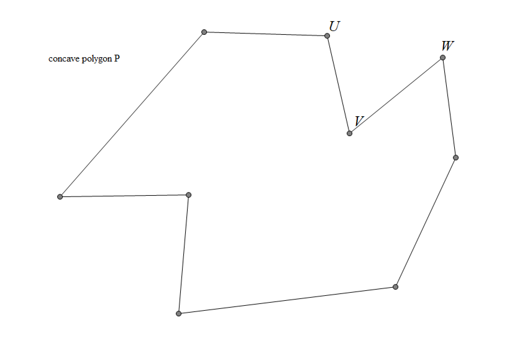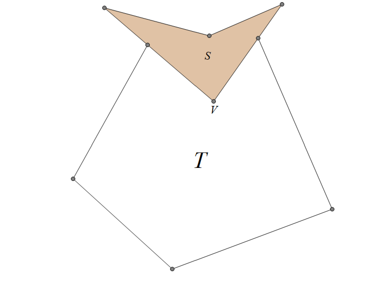 Case1) $V^\prime$ 존재 안함 $S$ 의 꼭짓점 중 $\overrightarrow{VU}, \overrightarrow{VW}$ 위에 존재하는 점을 각각 $A,B$라 하자. $Q$ 의 볼록성에 의하여 $A$ 와 $B$ 모두 $T$ 내부의 임의의 점 $C$에 대해 $\overline{AC} \subset T, \overline{BC} \subset T$를 만족해야한다. $C$를 $U,W$와 인접한 $T$ 의 꼭짓점으로 잡는다면 조건을 만족시키기 위해선 $A = U, B = W$여야함이 자명하다. 따라서 $S$ 는 $U,V,W$를 꼭짓점으로 가지고 $\triangle UVW$를 포함하는 오목사각형이어야한다. 이는 존재하지 않으므로 모순이다.