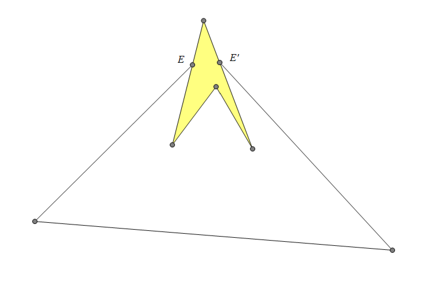 Case 2) $V^\prime$ 존재 Case 1에서와 완전히 동일한 논리를 이용하면 $S$ 는 아래 그림에서 $E, E^\prime$ 을 꼭짓점으로 가져야한다. 이 경우는 $T$ 가 원래 내부에 빈공간이 존재해 단순한 다각형이 아니게 되므로 오목다각형이라는 것에 모순이 된다.