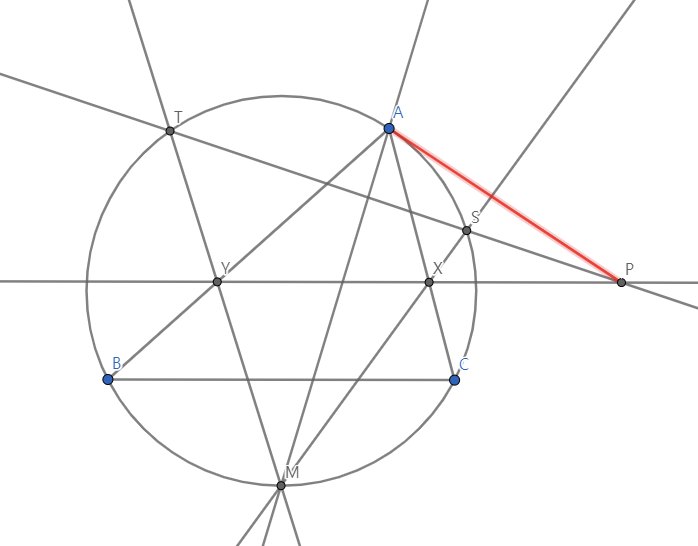 예각 삼각형$ABC$와 외접원 $w$가 있다. $∠A$의 이등분선이 $w$와 만나는 점을 $M, \overline{BC}$에 평행한 직선이 $ \overline{AC}, \overline{AB}$와 만나는 점을 각각 $X, Y$라 하고 $ \overline{MX}, \overline{MY}$가 $w$와 만나는 점을 각각 $S,T$라 하고, $ \overline{XY}$와 $ \overline{ST}$의 교점을 $P$라 할 때, $ \overline{PA}$가 $w$의 접선임을 증명해라.